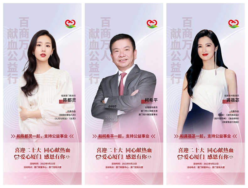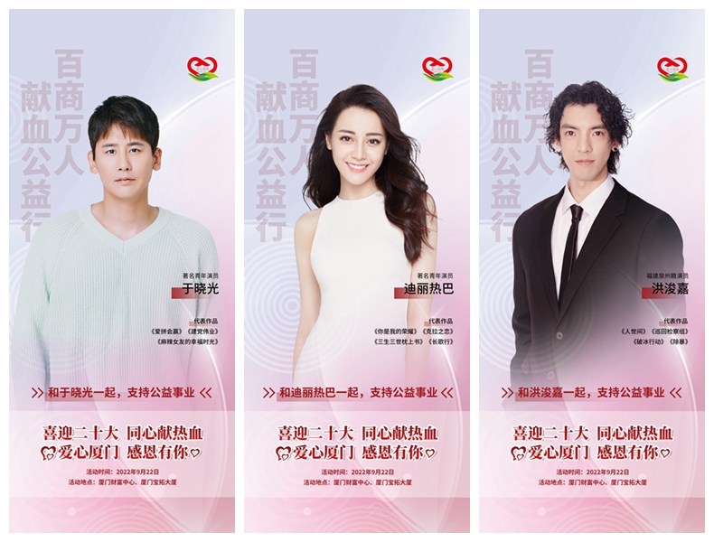 【廈門晚報】9月22日,由市工商聯(總商會)發起,并聯合廈門市中心血站、廈門恒興集團主辦的“百商萬人獻血公益行”活動,將在廈門財富中心和寶拓大廈同時舉辦。近日,迪麗熱巴、陳都靈、龔蓓苾、洪浚嘉、于曉光等影視演員紛紛為廈門這一公益活動發聲,拍攝視頻送上祝福,傳遞“愛心廈門 感恩有你”的正能量,號召愛心志愿者們助力廈門無償獻血公益事業。